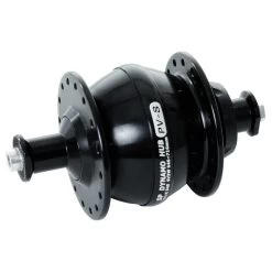 The hub dynamo belongs with 390 grams to the lightest in its class. It offers a very good efficiency of 72% at 15 km/h and low no-load losses. The rated power is 3 watts at a voltage of 6 volts. With hollow axle for quick release.